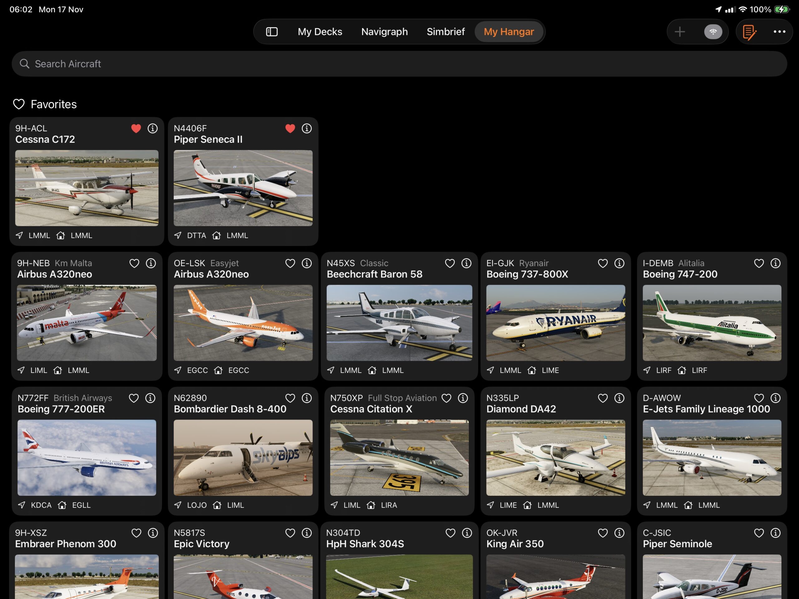 Your personal fleet, always at a glance. Each airframe is tracked with its own registration number, home airport and parking stand, and last parked location. See total hours flown, monitor wear and tear conditions, and keep tabs on fuel, oil, and system states. My Hangar gives you a real pilot’s view of aircraft ownership, turning every airplane into a persistent, living machine.