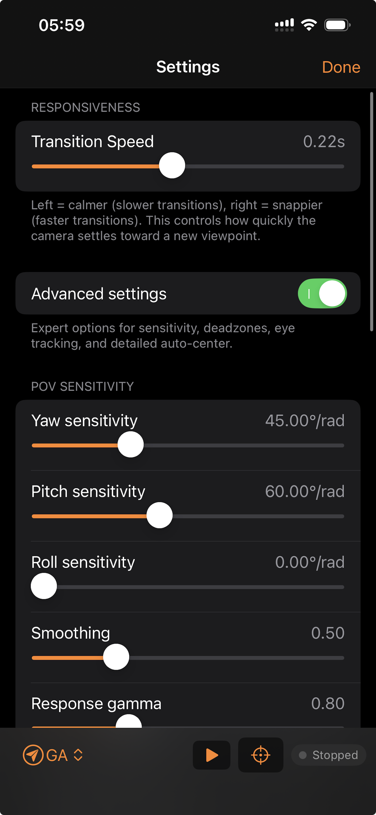 Create your own head-tracked camera positions with a single tap, and switch between them instantly. Perfect for setting up cockpit, instruments or passenger views that feel natural with head tracking. View changes are smoothly animated.